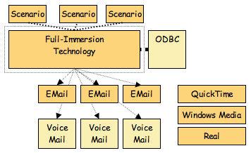 Each scenario may contain emails, video (presented online on the salesperson's computer), intranet and other web sites, phone messages, wireless text (SMS-to cellphones or PDAs), and simulated voicemail. These scenarios are implemented as sets of states and rules. A participant will always be in a single "state" within the scenario, and the system is paying attention to everything the participant does that's pertinent to that state. It may be sending an email from an in-game "character" to a participant, or waiting for the participant's response to that email. The scenario may have several timers set - and when one expires it may send a reminder to the participant. It examines each incoming email from each participant, and analyzes it against the rules for the current state of the scenario.